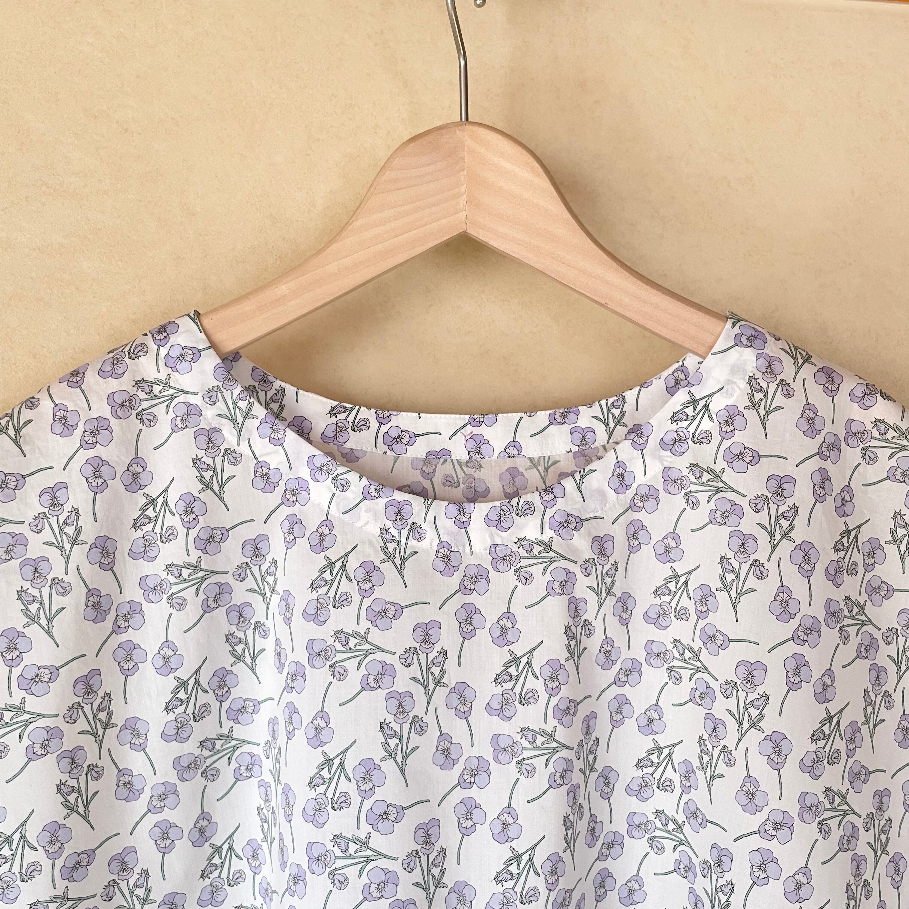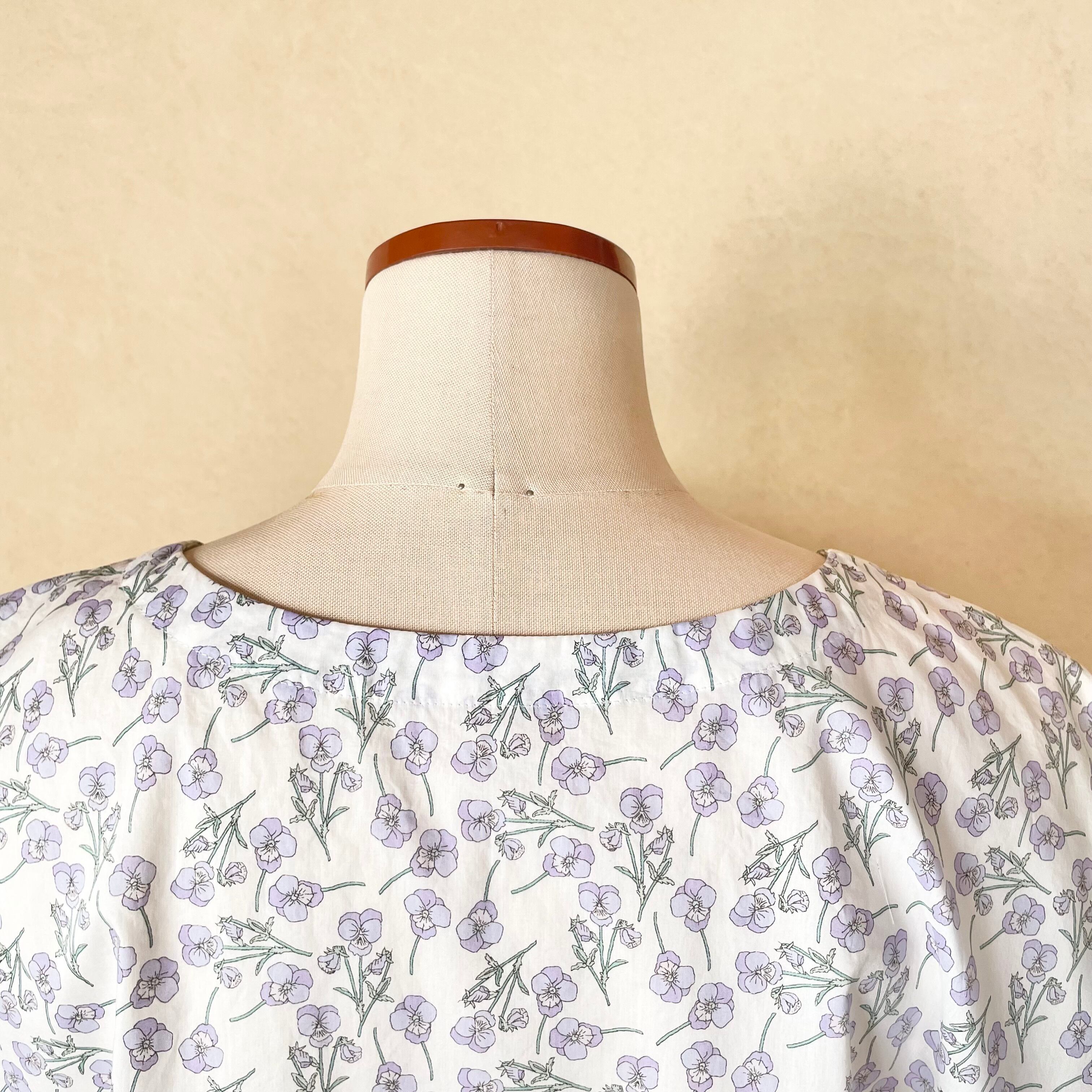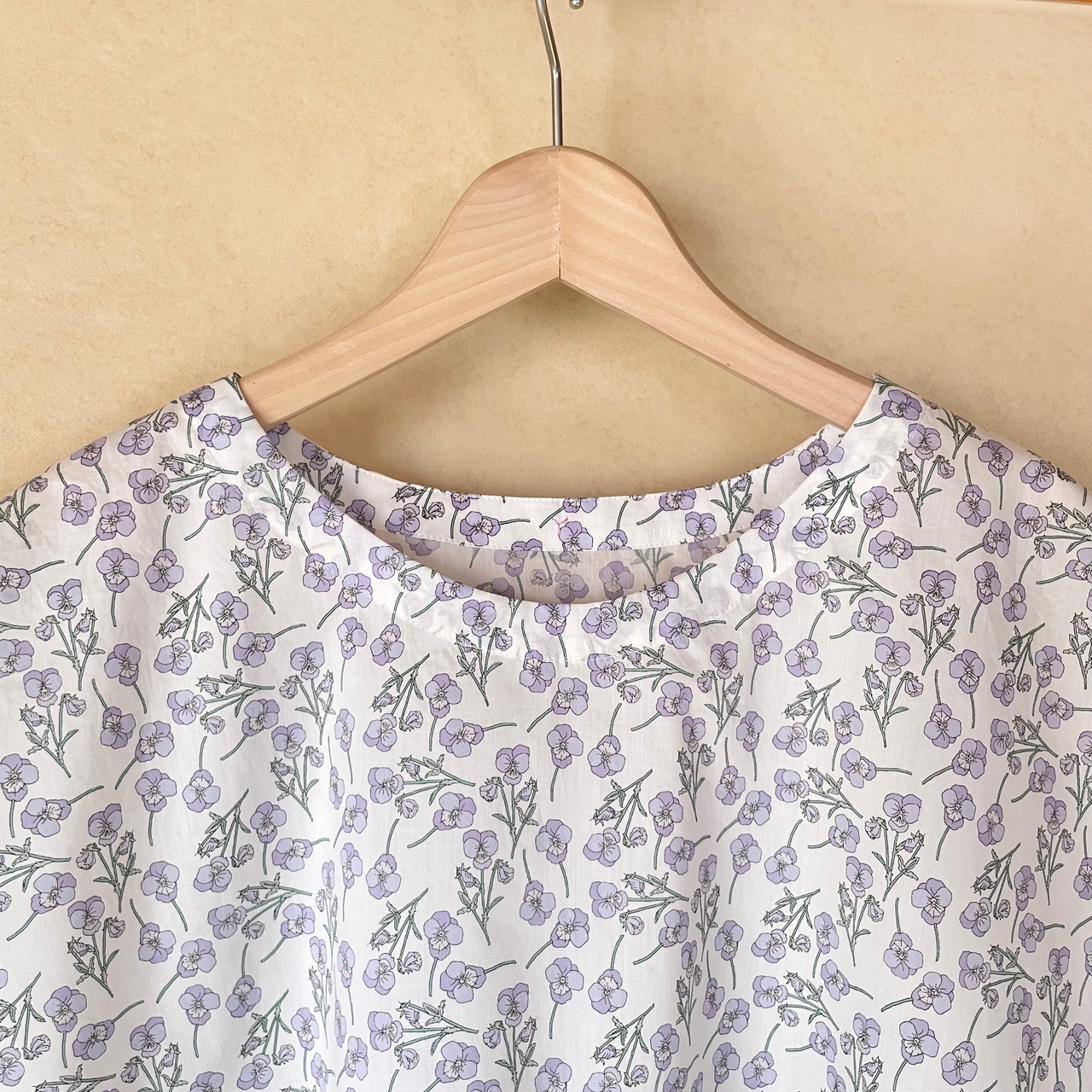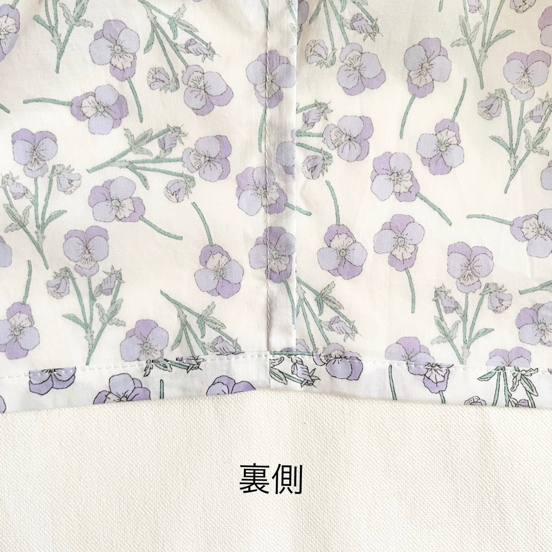 白地に薄紫系のパンジーが散りばめられた絵柄、Ros。