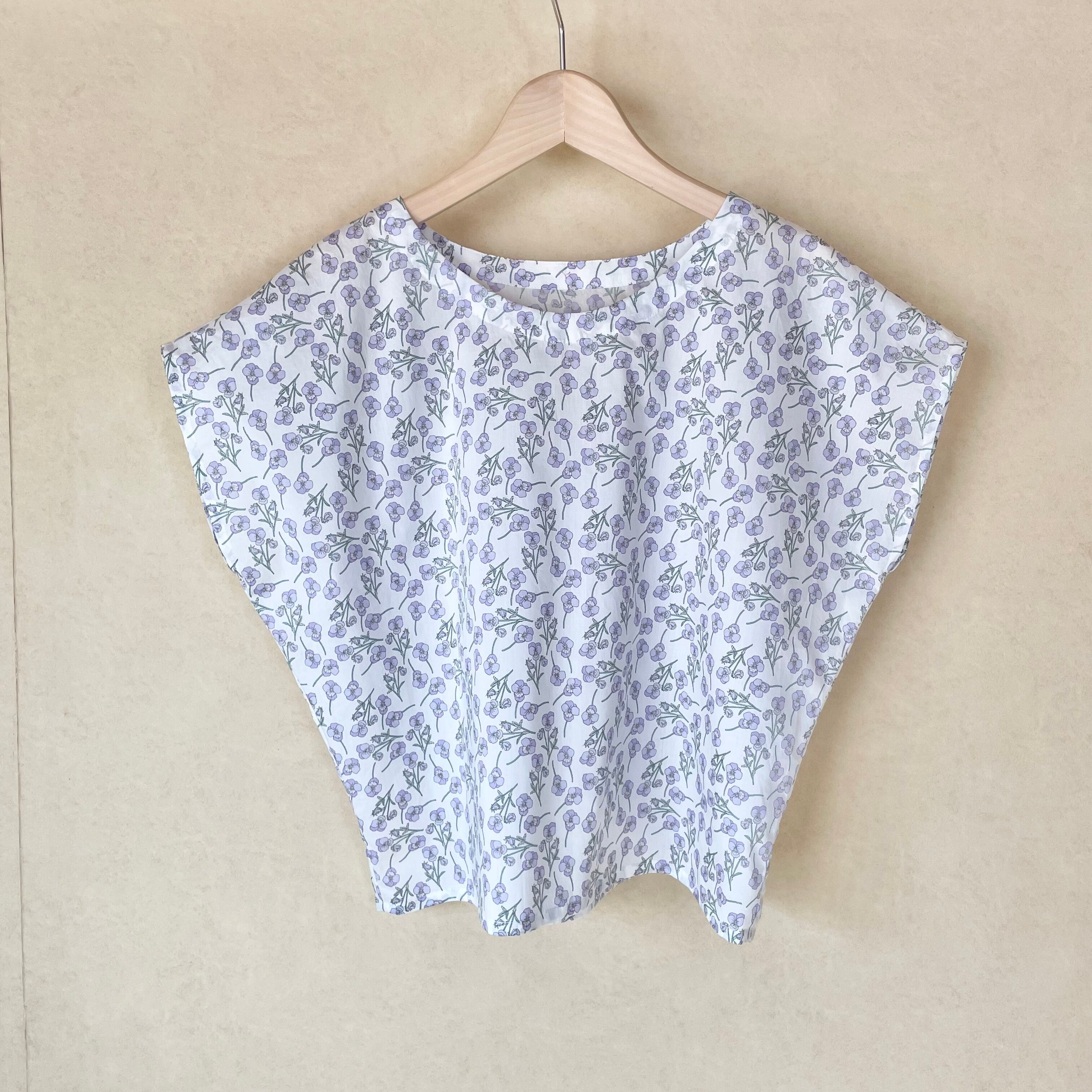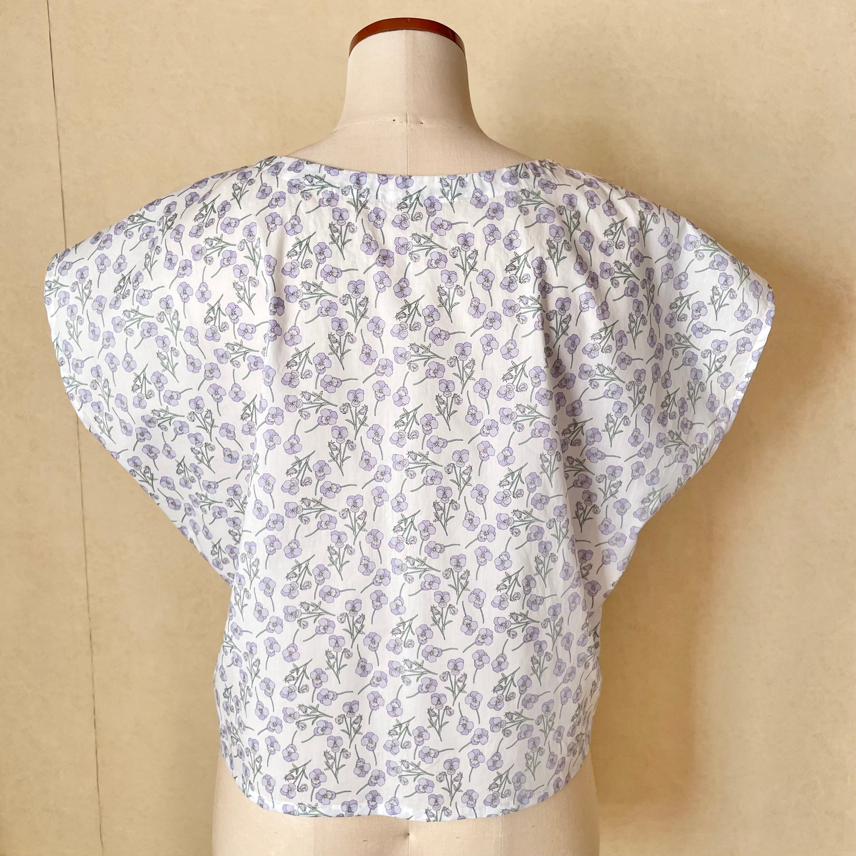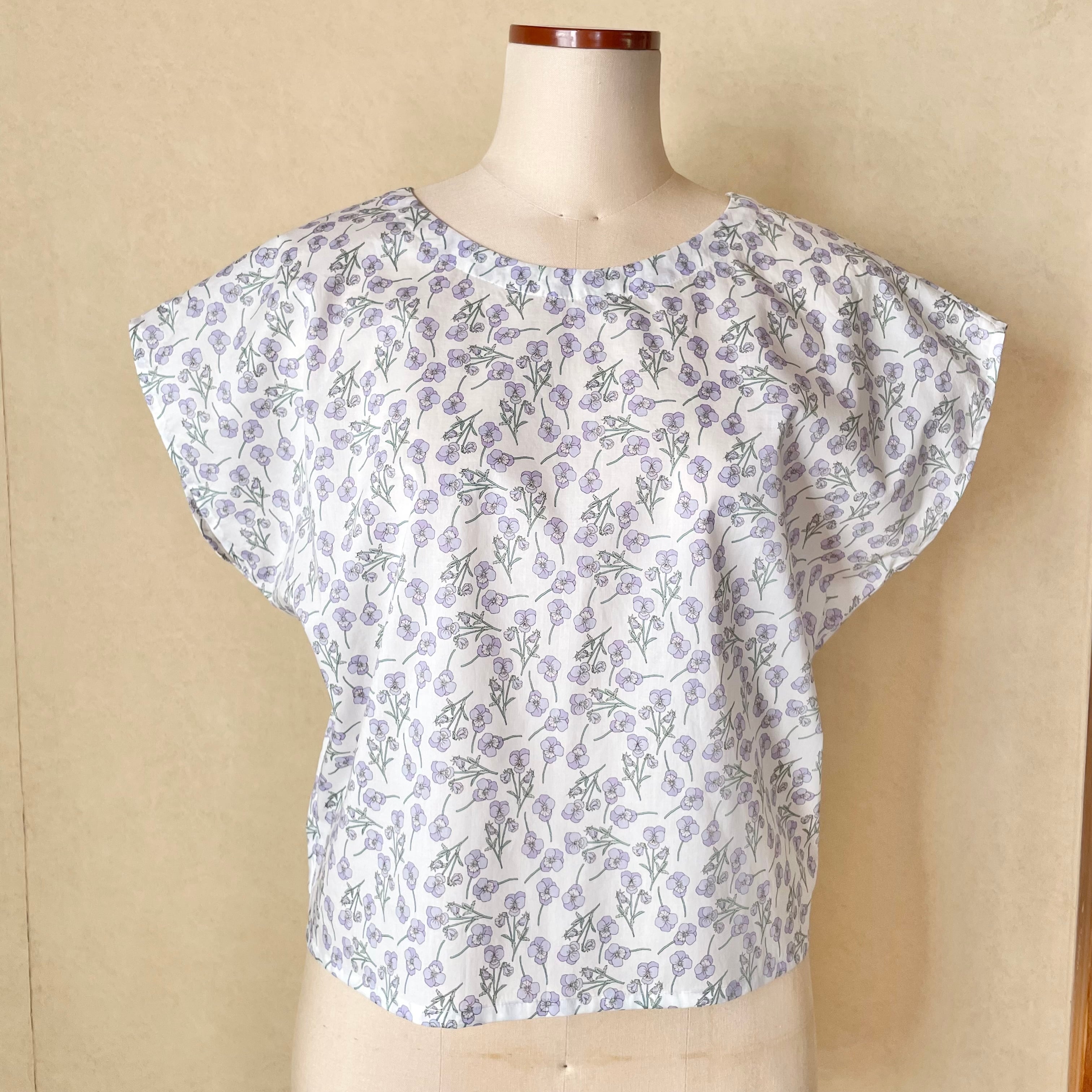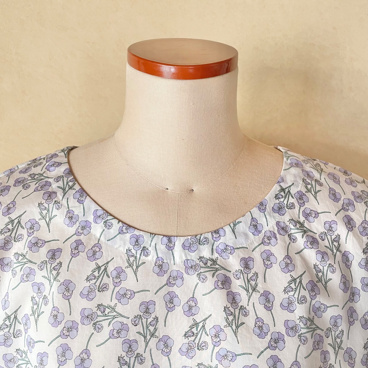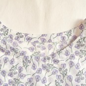 白地に薄紫系のパンジーが散りばめられた絵柄、Ros。