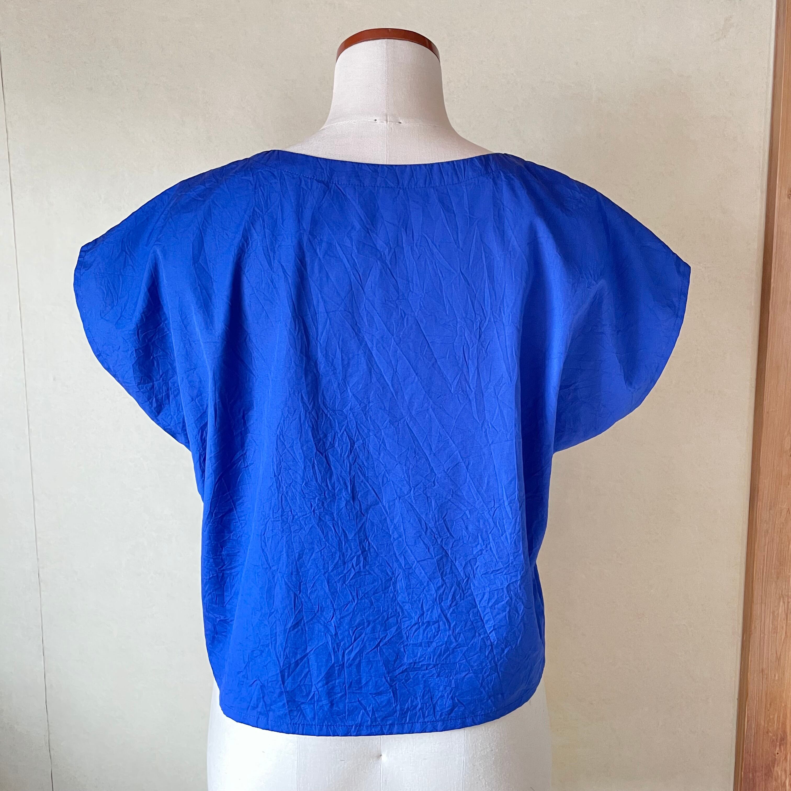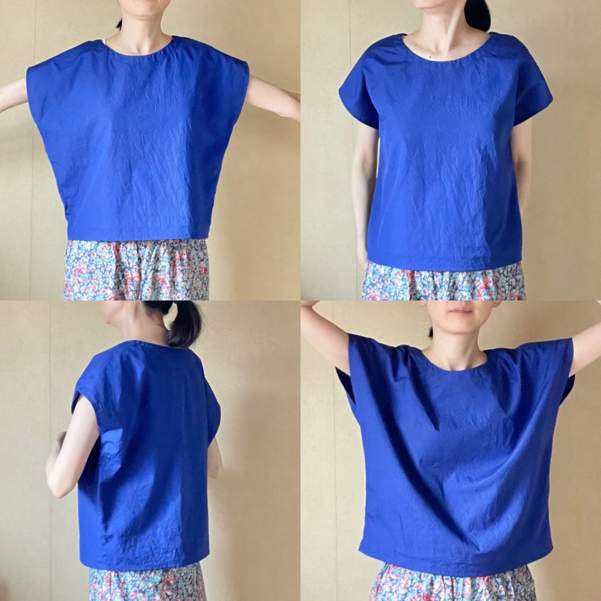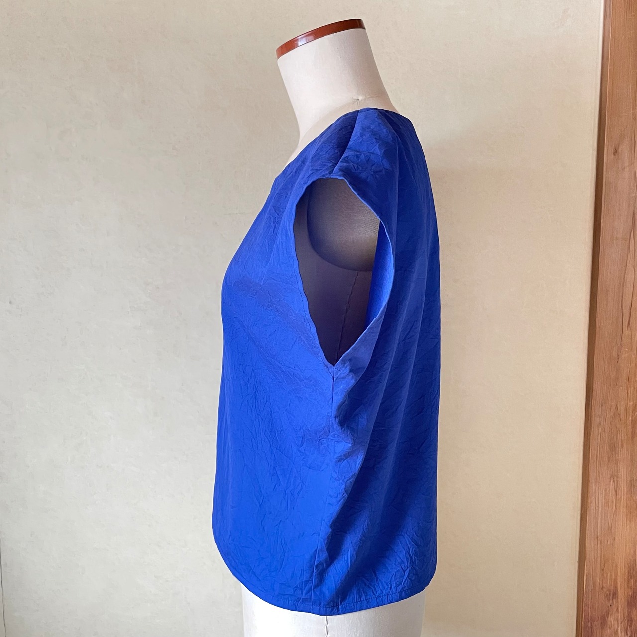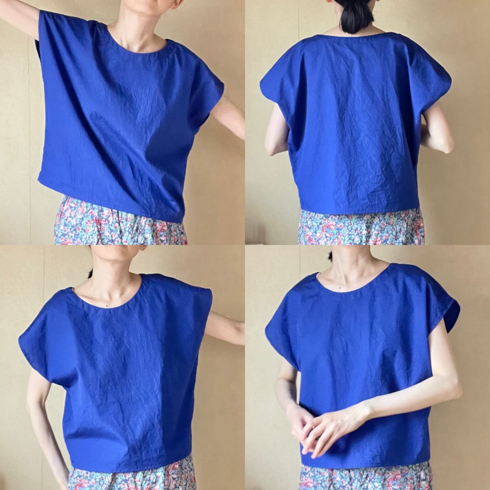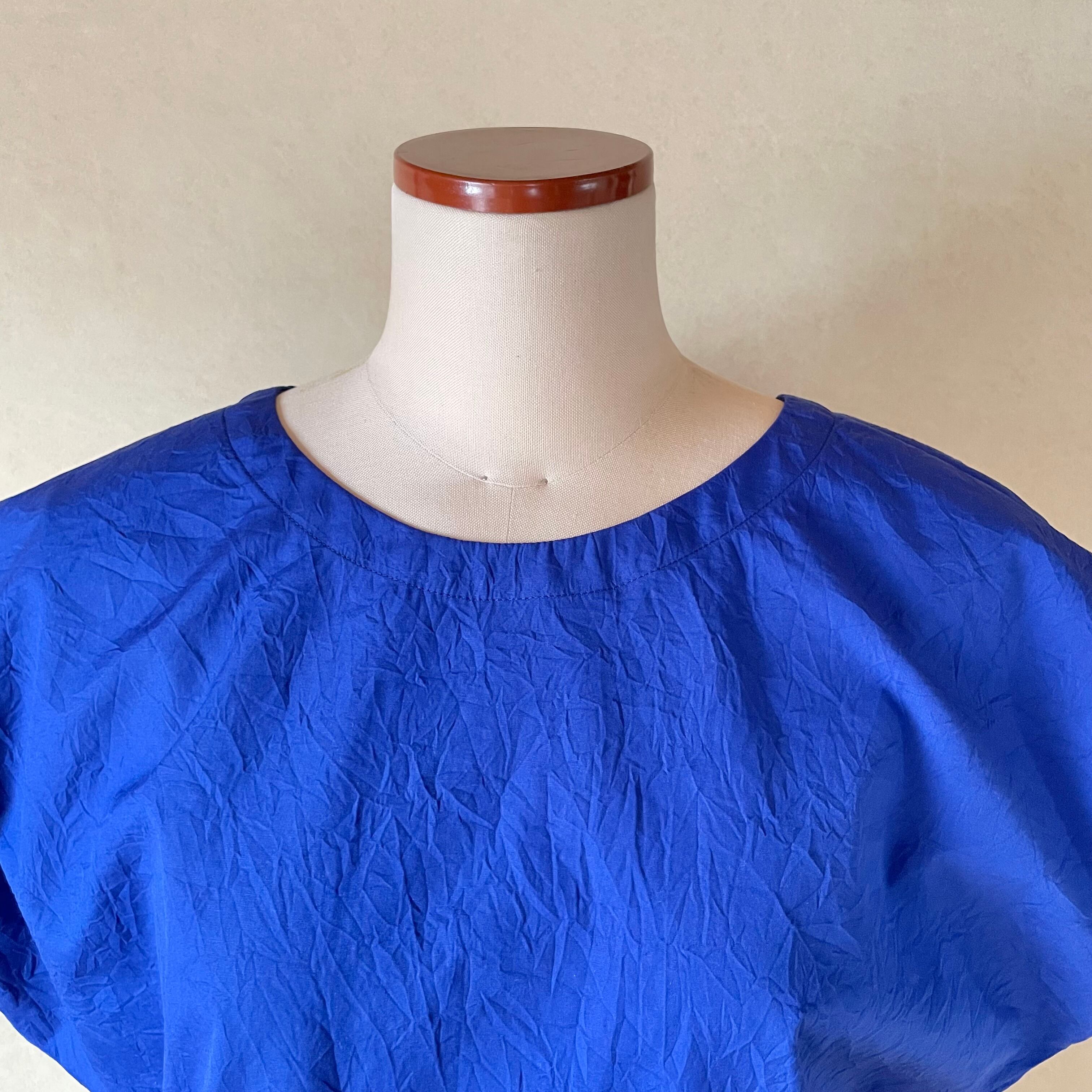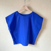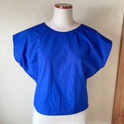 パキッとした青色のコットン生地で、フレンチスリーブのプルオーバーを仕立てました。