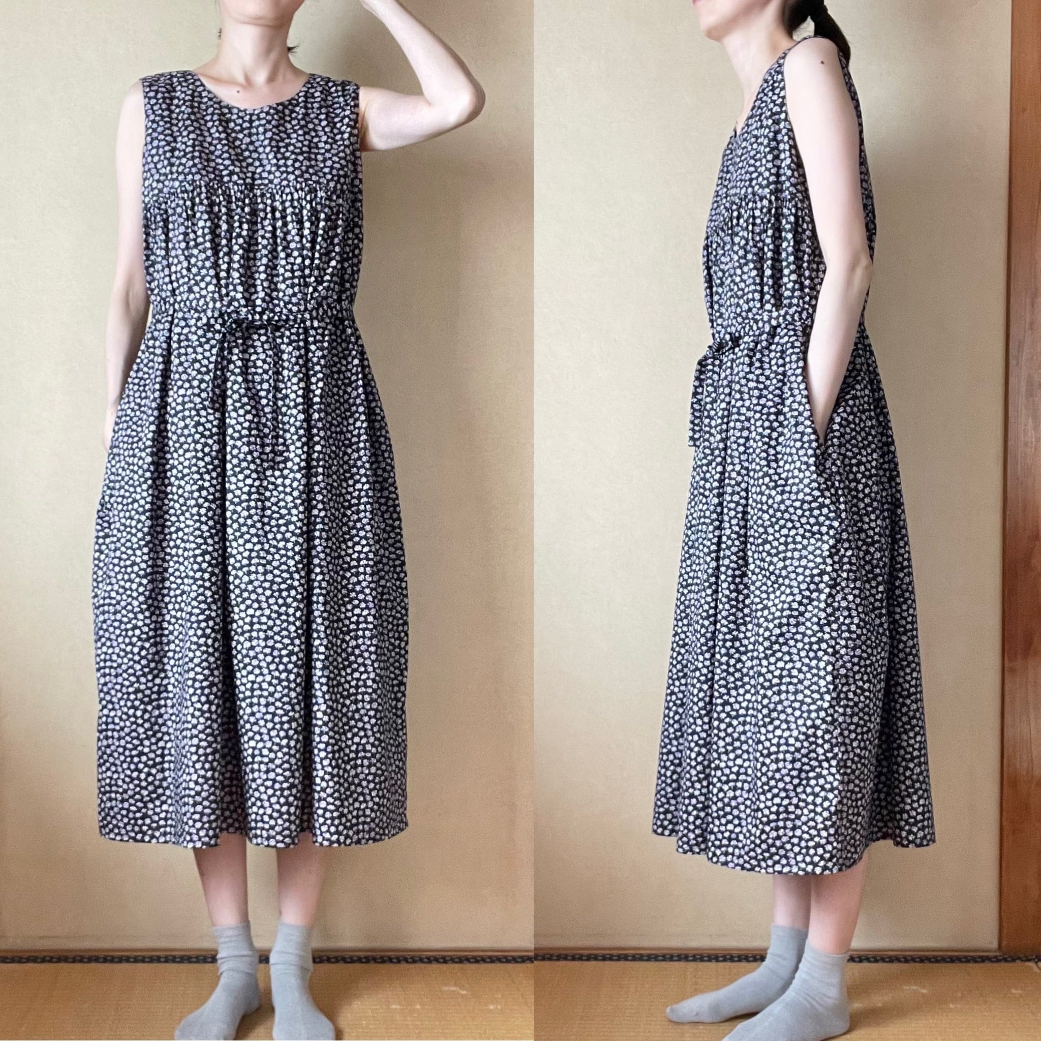 胸のラインで切替してギャザーを寄せたノースリーブワンピースです。