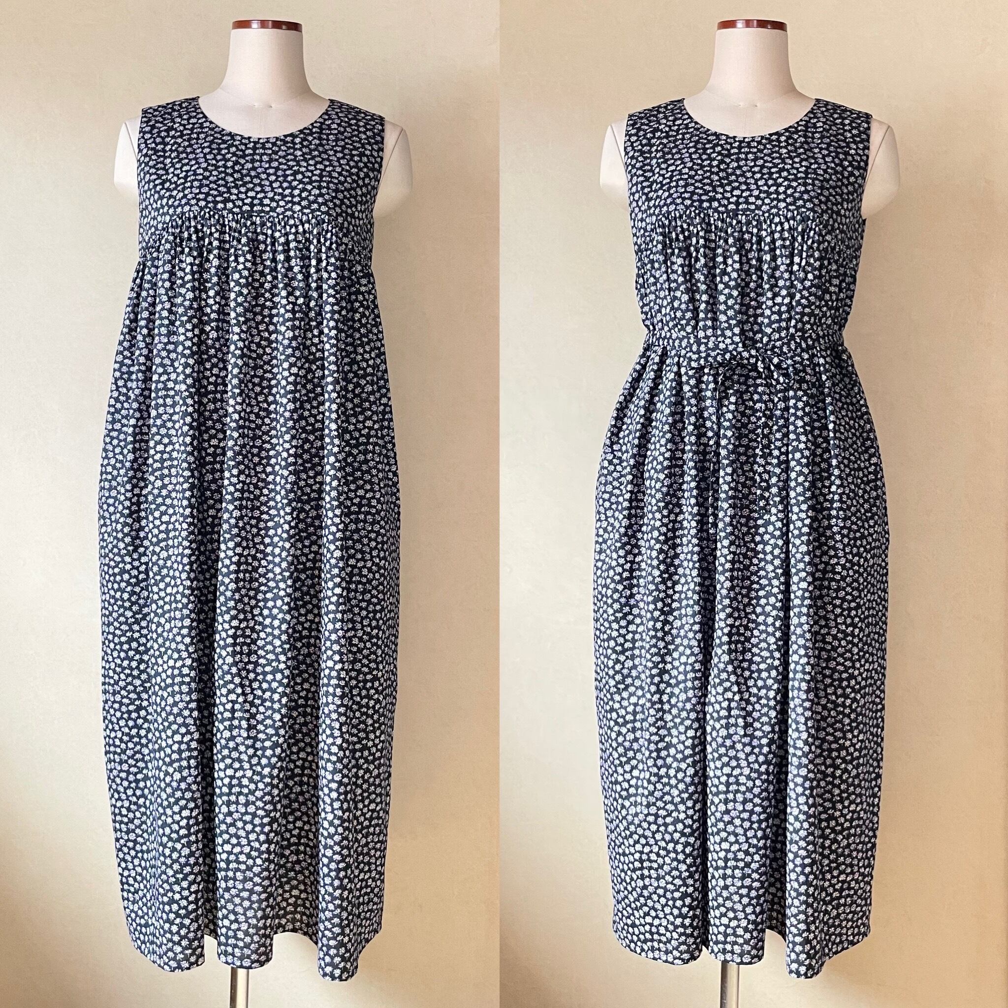 ロング丈で、さらりとしたリバティタナローン生地の質感を感じていただけると思います。