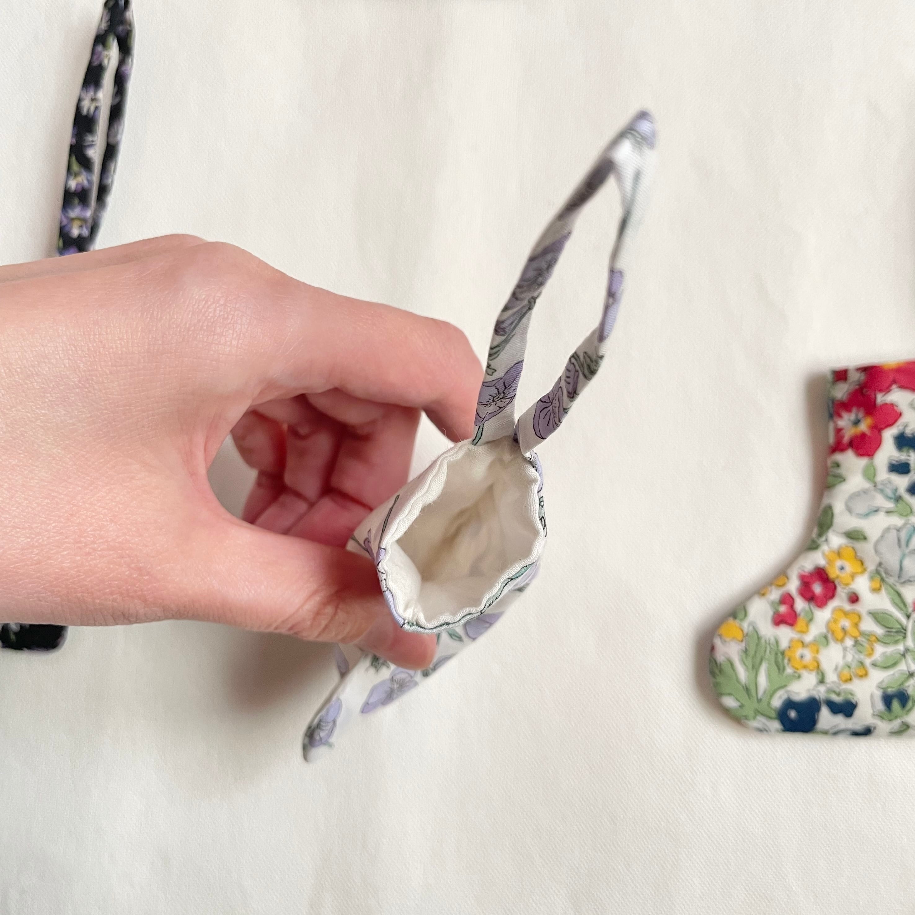 裏地は、きなり無地のローン生地、表地と紐はリバティプリントです。