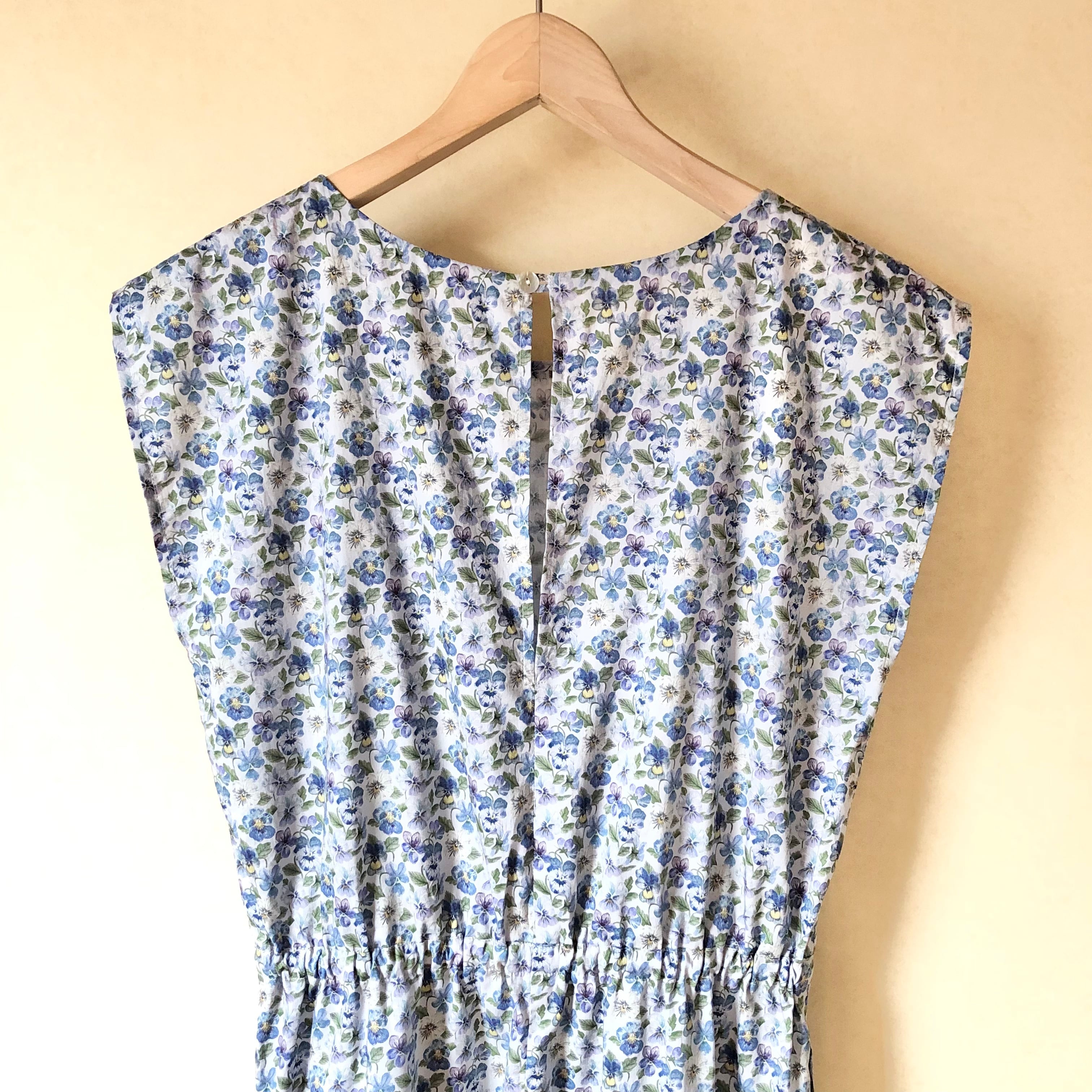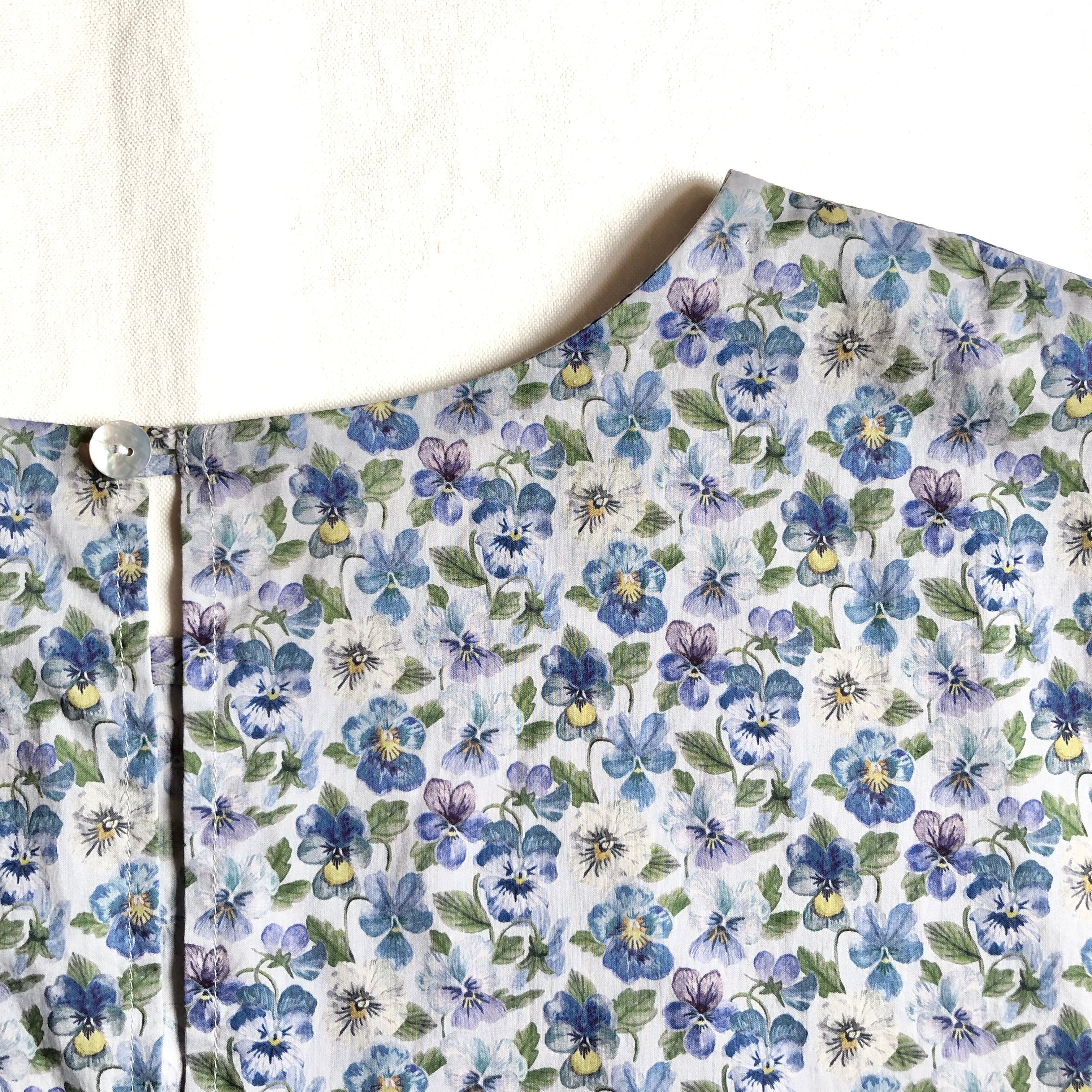 ブルーグレー地にブルー系のパンジーが一面に描かれた柄、Think of Me。